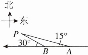 7. 如图,有一轮船由东向西航行,在 $A$ 处测得西偏北 $15^{\circ}$ 方向上有一灯塔 $P$,继续航行 $20$ 海里后到达 $B$ 处,此时又测得灯塔 $P$ 在西偏北 $30^{\circ}$ 方向上,若轮船航向不变,则灯塔与轮船之间的最近距离是