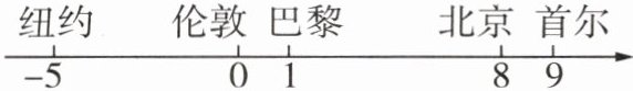 B 由题中数轴可知,纽约比巴黎晚1-(-5)=6(时),19-6=13,故对应的纽约时间为7月26日13时30分;伦敦比巴黎晚1-0=1(时),19-1=18,故对应的伦敦时间为7月26日18时30分;北京比巴黎早8-1=7(时),19+7=26,故对应的北京时间为7月27日2时30分;首尔比巴黎早9-1=8(时),19+8=27,故对应的首尔时间为7月27日3时30分.