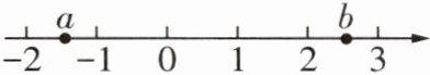 由图可知,$a$ 在数轴上的位置在 -2 和 -1 之间,是一个负数;$b$ 在数轴上的位置在 2 和 3 之间,是一个正数。