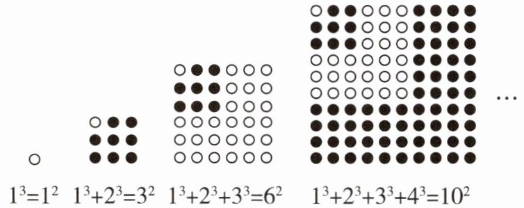 $1^{3}= 1^{2}$ $1^{3}+2^{3}= 3^{2}$ $1^{3}+2^{3}+3^{3}= 6^{2}$ $1^{3}+2^{3}+3^{3}+4^{3}= 10^{2}$