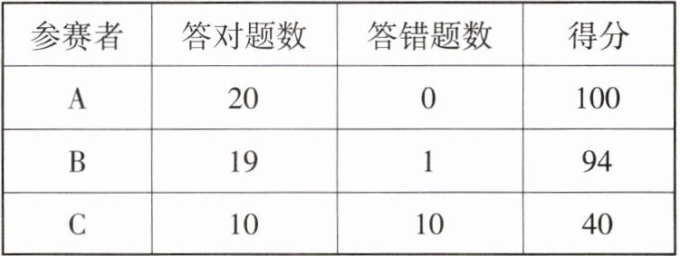 (2)设参赛者D答对了x道题,则答错了(20-x)道题,根据题意,得5x-(20-x)=88,解得x=18. 答:参赛者D答对了18道题.