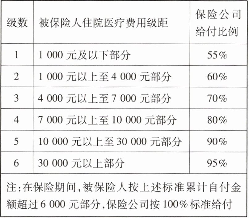 3 某中学为全体学生办理了学生团体住院医疗保险,保险公司按下表级距分段计算给付住院医疗保险金.