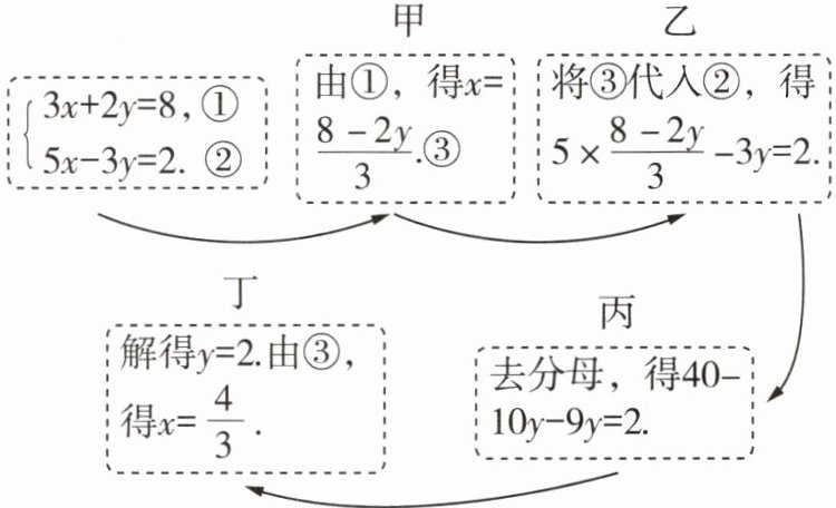 4 [2024 亳州段考]下面是某学习小组的 4 名成员合作完成的方程组的解题过程,解题过程中开始出现错误的同学是( )
