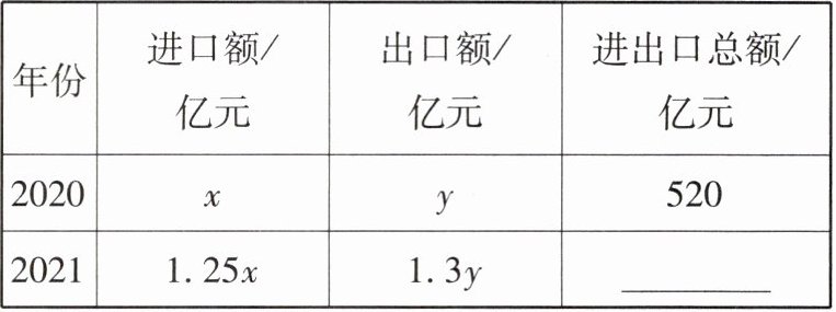 (1)设2020年进口额为x亿元,出口额为y亿元,请用含x,y的代数式填表: