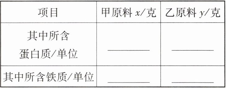 (2)如果一个运动员每餐需要32单位蛋白质和40单位铁质,那么每餐含甲、乙两种原料各多少克恰好能满足运动员的需要?
