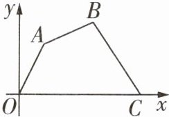 D 如图,过点 A 作 AE⊥x 轴于点 E,过点 B 作 BF⊥x 轴于点 F.因为 O(0,0),A(1,2),B(3,3),C(5,0),所以 OE=1,AE=2,BF=3,CF=2,EF=2.所以四边形 OABC 的面积=$S_{三角形AOE}+S_{三角形BCF}+S_{梯形ABFE}=\frac{1}{2}×1×2+\frac{1}{2}×3×2+\frac{(2+3)×2}{2}=9$.