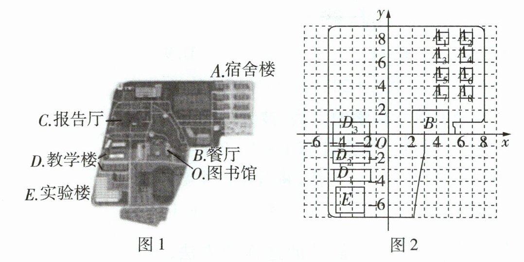 第一步:图2为该学校平面示意图简图,建立以图书馆为原点的平面直角坐标系,记建筑物中心点的坐标为该建筑坐标,该坐标系中1个单位长度表示的距离为50m.