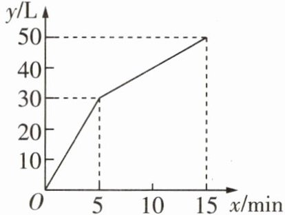 1 [2024 哈尔滨中考]一个有进水管与出水管的容器,从某时刻开始 5 min 内只进水不出水,在随后的 10 min 内既进水又出水,每分钟的进水量和出水量是两个常数. 容器内的水量 y(单位:L)与时间 x(单位:min)之间的关系如图所示,当 x = 9 min 时,y = ( )