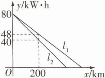 12 设l₁对应的函数表达式为y₁=kx+b(k≠0).将(0,80),(200,48)分别代入,得{b=80,200k+b=48,解得{k=-0.16,b=80,所以y₁=80-0.16x.同理,可得l₂对应的函数表达式为y₂=80-0.2x.当x=300时,y₁=80-0.16×300=32,y₂=80-0.2×300=20,32-20=12(kW·h),所以当两款新能源电动汽车行驶路程都是300 km时,A款新能源电动汽车电池的剩余电量比B款新能源电动汽车电池的剩余电量多12 kW·h.