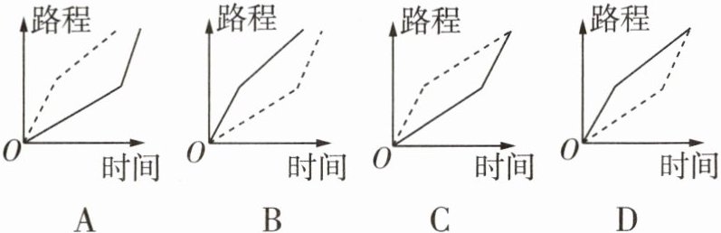 2 [2025安庆期末]甲、乙两人同时从A地到B地,甲先步行到中点改骑自行车,乙先骑自行车到达中点后改为步行.已知甲、乙两人骑车的速度和步行的速度分别相同,则甲、乙两人所行的路与所用时间的关系图正确的是(实线表示甲,虚线表示乙) ( )