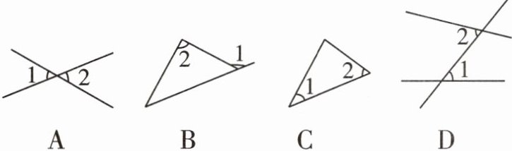 B A中∠1=∠2,故本选项不符合题意;B中由三角形的外角大于与它不相邻的任何一个内角可知∠1>∠2,故本选项符合题意;C中∠1和∠2的大小关系不能确定,故本选项不符合题意;D中延长直线会在右侧有交点得出∠2>∠1,故本选项不符合题意.