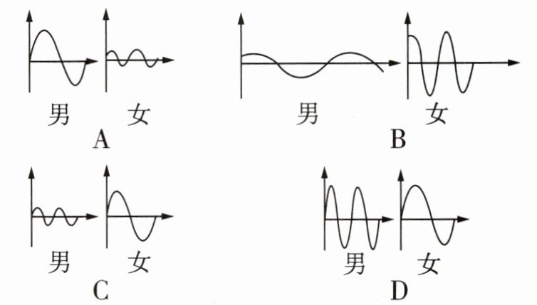 5 男低音歌唱家大声独唱,女高音歌唱家轻声为他伴唱,则两位歌唱家的声音特征分别对应下列波形图组的是(纵轴表示振幅,横轴表示时间)(