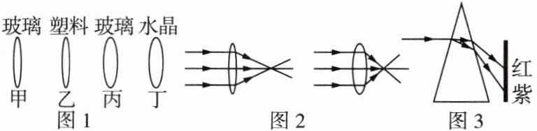 (填“控制变量法”或“转换法”)。(3)联想到光的色散现象(如图3),如果分别用红光和紫光测同一个凸透镜的焦距,用