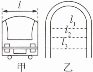 6 新考法[2023常州中考改编]如图甲所示,某新式列车车厢的宽度l= 3.500m。为判断新式列车车厢能否通过一老式隧道,技术人员分别测量了隧道内部三处的宽度,如图乙所示,测量结果为:$l_1= 3.600m、$$l_2= 3.480m、$$l_3= 3.540m。$技术人员使用的刻度尺分度值为____