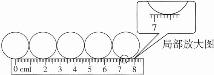 【答案】1.85【解析】如题图所示,刻度尺的分度值为0.1 cm,读数时要估读到分度值下一位,所以硬币四个直径之和为7.40 cm,所以测得硬币的直径$d=\frac{7.40\ \text{cm}}{4}=1.85\ \text{cm}$。