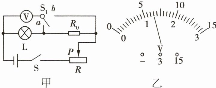 V。(2)在确保整个电路安全的情况下,保持滑片P的位置不变,将开关$S_{1}$拨到另一触点,此时电压表的示数如图乙所示,其数值为