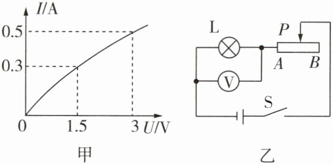 5 [2024郑州金水区模拟]小灯泡L的额定电压为3V,它的I-U图像如图甲所示。把小灯泡接入如图乙所示的电路中,先将滑动变阻器的滑片P移至B端,闭合开关S,电压表示数为1.5V;再将滑片P向左移动直到电压表示数为3V。已知电源电压恒定,滑动变阻器的铭牌标有“10Ω 2A”。下列说法中错误的是(