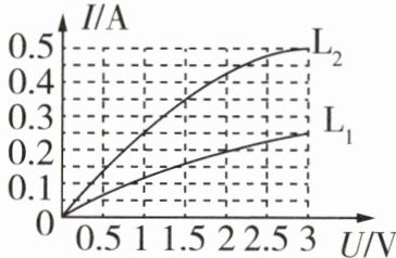 4 灯$L_1、$$L_2$分别标有“3V 0.75W”和“3V 1.5W”字样,通过$L_1、$$L_2$的电流随其两端电压变化的图像如图所示。若将$L_1、$$L_2$并联接在3V电源两端,则电路消耗的总功率为
