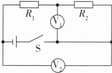 1 如图所示电路,电源电压不变,闭合开关S,电压表$V_1、$$V_2$示数之比为2:3。下列说法正确的是(