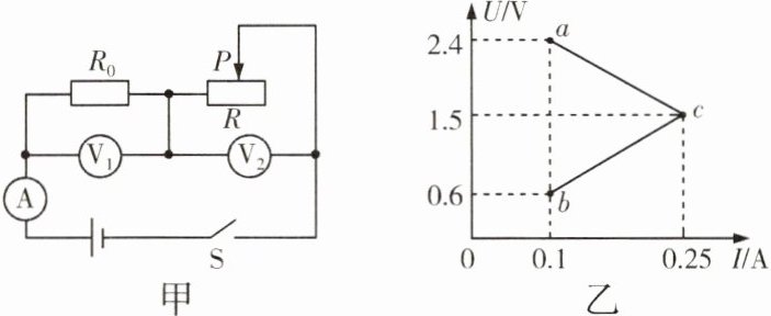 9 如图甲所示,电源电压U恒定,R₀为定值电阻,R为滑动变阻器。闭合开关S,调节滑动变阻器的滑片P,两电压表$V_1、$$V_2$的示数随电流表示数变化的图像如图乙所示,则下列说法错误的是(