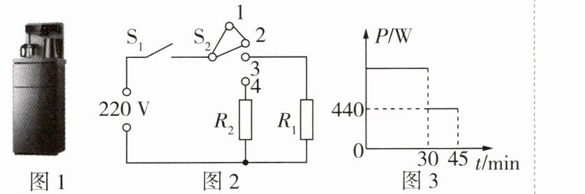 (1)由题图2可知,当开关S₁闭合,S₂接触3、4时,R₁、R₂并联,电路中的总电阻最小,由$P=\frac{U^{2}}{R}$可知,电路中的总功率最大,茶吧机处于加热挡。
