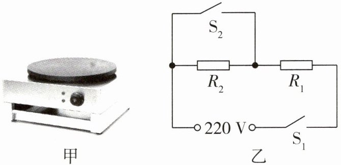 1 [2024乐山中考]如图甲所示的煎饼锅具有高温和低温两个挡位,图乙是其内部简化电路图。当处于高温挡时,煎饼锅的加热功率为968W,则$R_{1}=$