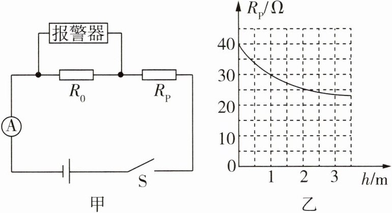 13 [2024济南中考]学校开展了防溺水安全教育后,小华组经过合作探究,设计了一种可以戴在手腕上的防溺水定位求救报警器,其简化电路如图甲所示。已知电源电压为6V,报警器由电压表改装,R_{0}是定值电阻,R_{P}是压敏电阻,图乙是压敏电阻阻值R_{P}随水深h变化的图像。报警器未浸入水中时,R_{P}的阻值为40Ω,电流表示数是0.12A;报警器浸入水下深度h大于等于1m时,报警器报警,当h为1m时,R_{0}两端的电压为1.5V。通过计算回答: