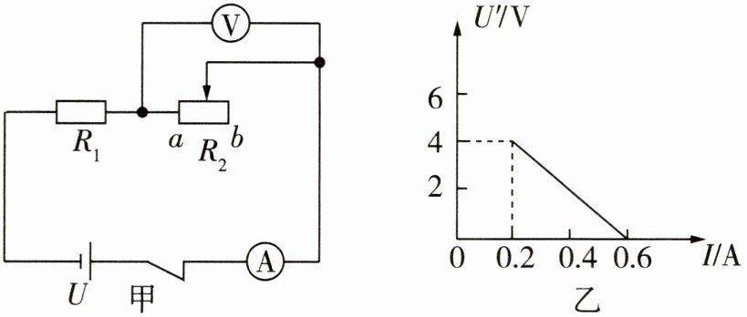 当滑动变阻器$R_{2}的滑片从b移到a$时,两电表$U'-I$关系如图乙所示,则$U= $