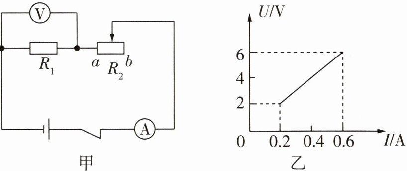 当滑动变阻器$R_{2}的滑片从b移到a$时,两表$U-I$关系如图乙所示,则$U= $