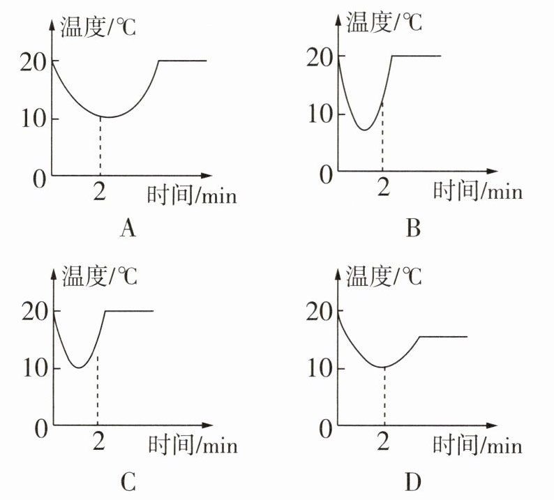 浸有少量酒精的棉花裹在温度计的玻璃泡上,其示数经过2 min,由$20\ \celsius$降至$10\ \celsius$左右,然后温度逐渐上升到$20\ \celsius$