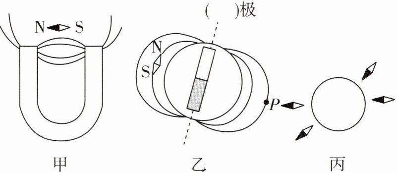(2)请在图乙中括号处标出地磁场的磁极,并用箭头标出P点的磁感线方向。