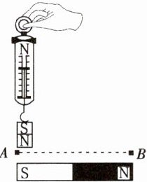 C 条形磁体两端磁性最强而中间磁性最弱,且同名磁极相互排斥,异名磁极相互吸引,所以当小磁体从条形磁体的左端移向中间时,二者间相互吸引力逐渐减小;当从条形磁体的中间移向右端时,相互排斥力逐渐增大。故小磁体从A移到B时,弹簧测力计的示数是逐渐变小的。故C符合题意。