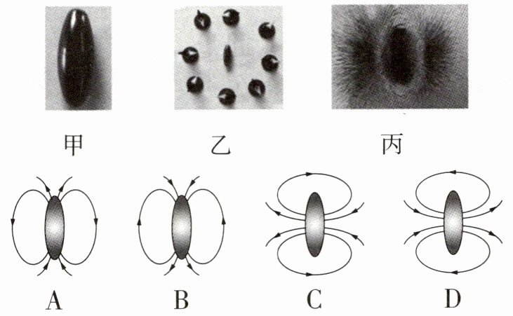 4 [2024北京模拟] 小冬学习磁学知识后,想研究橄榄形磁体周围的磁场分布情况,做了如图所示的实验,其中图乙是小磁针(黑色为N极)静止时的指向,图丙是铁屑静止时的分布情况。下列选项能正确用磁感线描述以上实验现象的是(