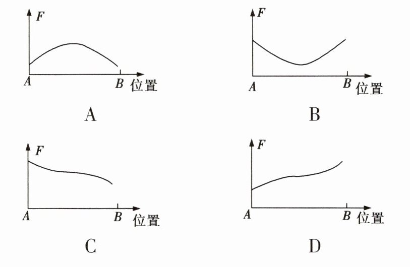7 [2024贵阳师范大学附中一模改编] 如图所示,在水平放置的条形磁体上方,有一个挂有小磁体(下部N极)的弹簧测力计。小辉提着弹簧测力计向右缓慢移动,使得小磁体下端沿图示水平虚线从A缓慢移到B。则能反映弹簧测力计示数F随小磁体位置变化的图像是(