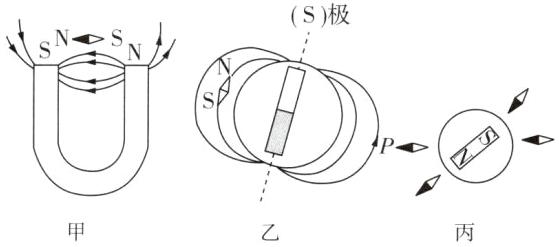 6 教材习题改编(1)请在图甲中标出U形磁铁磁感线的方向及磁铁的N极和S极。