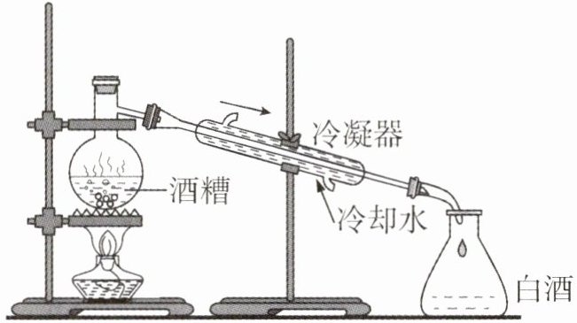 6 [2024泸州中考改编,双选]蒸馏法在酿酒过程中得到广泛应用,如图所示为蒸馏过程中的原理图,烧瓶内装有含酒精和水的酒糟,在蒸馏的过程中,涉及的物理知识说法正确的是 (