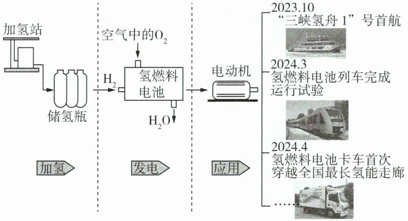 4 据统计,每燃烧1kg燃油约排放3.3kg的二氧化碳,为实现碳达峰、碳中和的目标,氢能作为一种绿色低碳的清洁能源在我国交通领域的应用场景不断扩大,使用氢燃料电池的交通工具不断丰富,其应用流程如下: