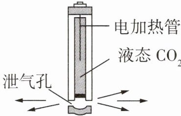 5 跨学科实践[2024山西中考]二氧化碳$(CO_2)$爆破技术是现代工程建设中非常环保的技术。起爆前高压泵将$CO_2$压缩成高压气体,液化后输入爆破筒内。如图所示,爆破时电加热管发热,使筒内的液态$CO_2$迅速汽化,形成的高压气体从泄气孔中喷出,实施爆破。下列说法正确的是(