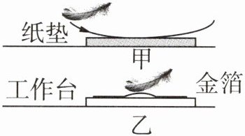6 新情境 [2025河南省实验中学期中改编]“金陵金箔”是国家级非物质文化遗产,金箔轻薄柔软,不能用手直接拿取。如图,工匠手持羽毛扫过纸垫,再将羽毛靠近工作台上的金箔,即可吸起金箔。羽毛与纸垫摩擦后,羽毛由于