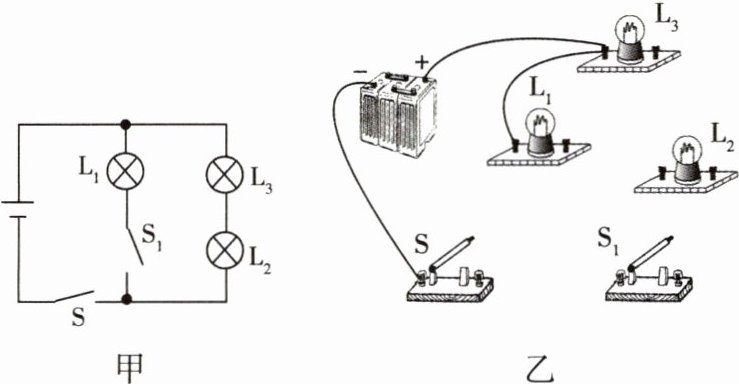 [解析] 采用电流流向法,电流从电源正极出发,依次通过灯泡L₁、开关S₁、开关S回到电源的负极;将灯泡L₂和L₃串联起来,再并联在灯泡L₁和开关S₁的两端即可。