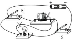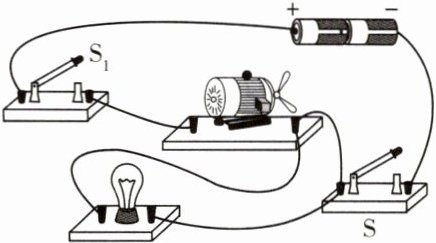 8 在如图的电路中,有一根导线连接错误,请将错误导线用“×”标出,并画出正确的连线。要求:改正后,灯泡和电动机并联,开关S控制所有用电器,$S_{1}$只控制电动机。