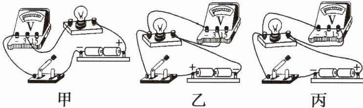 7 如图所示是小组三名同学用电压表测量小灯泡两端的电压的实物图,结合电压表使用说明,帮助小星指出甲、乙、丙三图中电压表的使用错误之处。