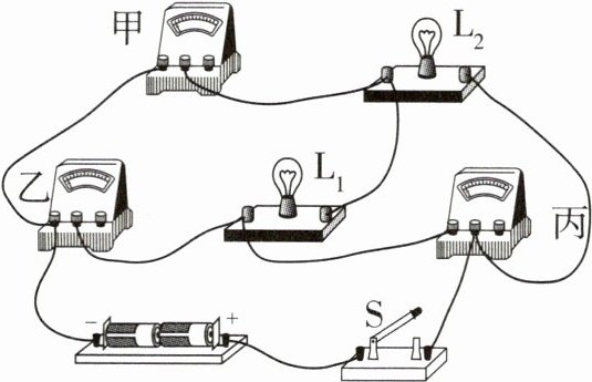 7 [2023 济南中考]如图所示的实物电路由电源、开关S、两个小灯泡$L_1、$$L_2$和甲、乙、丙三个电表(电流表或电压表)组成。闭合开关S后,两个小灯泡$L_1、$$L_2$均能发光。下列关于甲、乙、丙三个电表的判断,正确的是( )