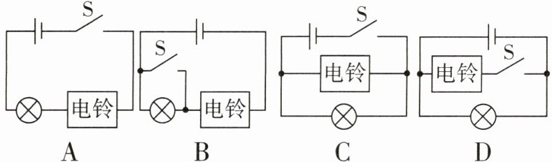 4 [2024 天津中考]某兴趣小组要为居家老人设计一个“应急呼叫器”电路,要求:开关断开时,电灯和电铃均不工作;开关闭合时,灯亮铃响,即使电灯因开路不亮,电铃仍可工作。如图所示的电路中,符合设计要求的是( )