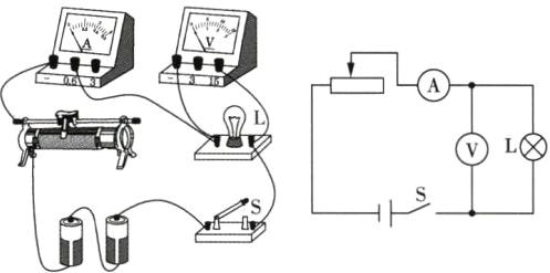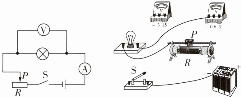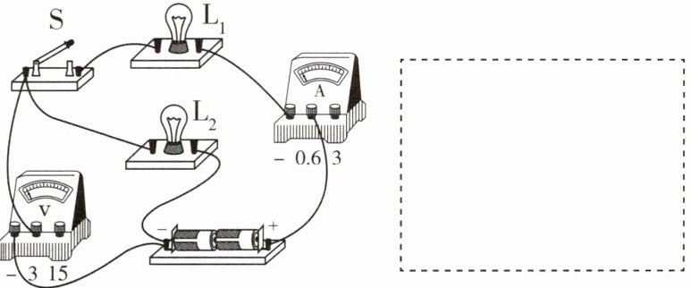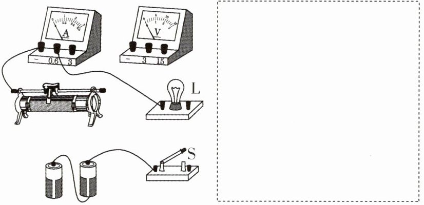 5 请连接实物图并在虚线框中画出电路图。要求闭合开关后:(1)用滑动变阻器控制灯L的亮度。(2)当滑片向右移动时,灯L变暗。(3)电流表、电压表分别测灯L中的电流和其两端的电压。