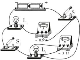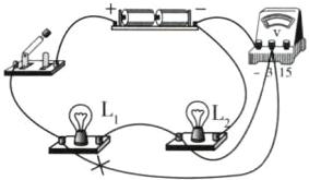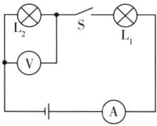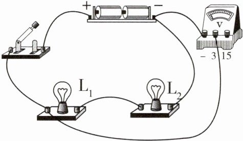 6 如图,要测量小灯泡$L_2$两端的电压,请找出那根连错的导线,在这根导线上画“×”,并用笔画线重新画出一根正确连线。