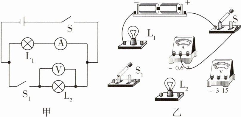 2 根据题图甲所示的电路图,将如图乙所示的实物元件连接起来。(注意流过两个灯泡的电流都约为0.5A,导线不能交叉)