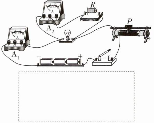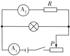 [解析] 由实物图知,灯泡与定值电阻并联,开关在干路上,A₂在定值电阻所在的支路上,A₁在干路上,干路上串联一个滑动变阻器,且滑片P向右滑动时,滑动变阻器接入电路的电阻变大,由此画出电路图。