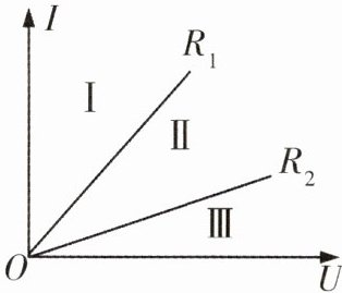 1 [2025北师大实验中学月考]有两个阻值不同的定值电阻R_{1}、R_{2},它们的I - U图线如图所示。如果R_{1}、R_{2}串联后的总电阻为R,并联后的总电阻为R',则关于R、R'的I - U图线所在的区域,下列说法正确的是(