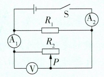 4 [2024济南中考]某学习小组连接了如图所示的实物电路,闭合开关,移动滑片P的过程中,关于电流表$A_{1}的示数I_{1}$、电流表$A_{2}的示数I_{2}$以及灯泡的亮度,可能出现的现象是(